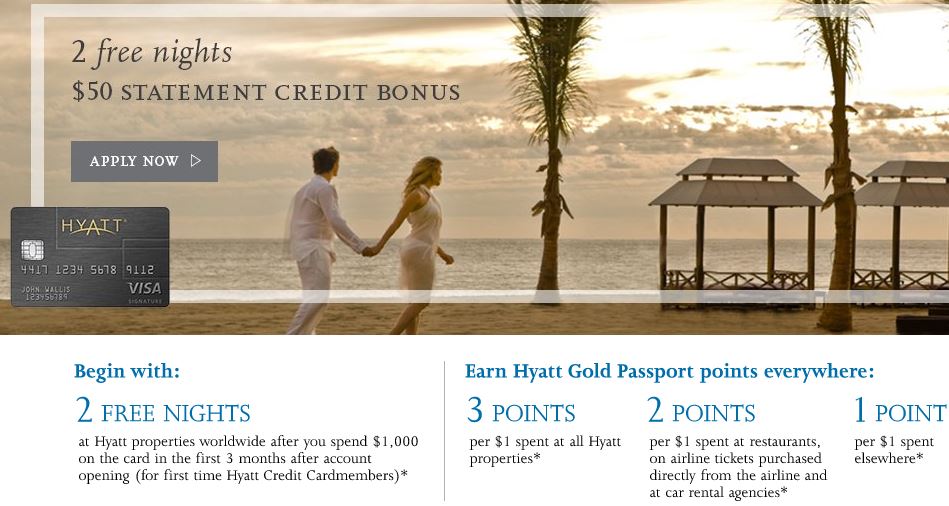 Last night, while helping a client map out a personalized credit card application strategy, I was recommending the Chase Hyatt Visa credit card but I couldn’t remember if the $50 statement credit “hack” was still around. After pretending to make a reservation on hyatt.com, sure enough there was an offer for a $50 statement credit on the card in addition to the 2 Free Nights with the annual fee waived for the first year. Basically Chase is paying you$50 to acquire 2 Free Hotel nights – sounds good to me!