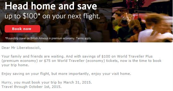 British Airways is sending emails to certain Executive Club members offering a $75 discount on World Traveller (economy) flights or $100 discount on World Traveller Plus (premium economy) flights if booked by March 31st. You can travel now through October 1st.