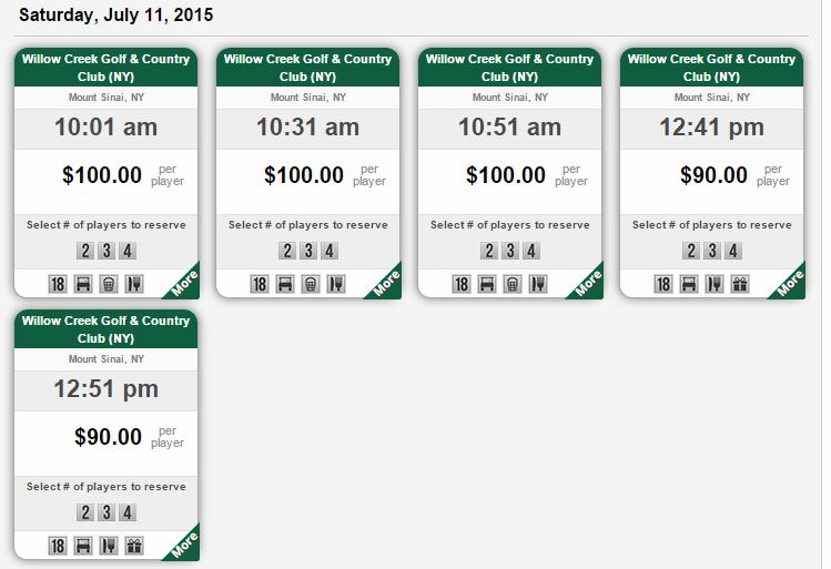 I’ve been playing around on the site which offers an easy, user friendly interface that seems to offer a wide range of options from the testing I’ve done. To test it, I searched for tee times for next weekend on Long Island and also searched for a tee time next Wednesday to see how the results compared.