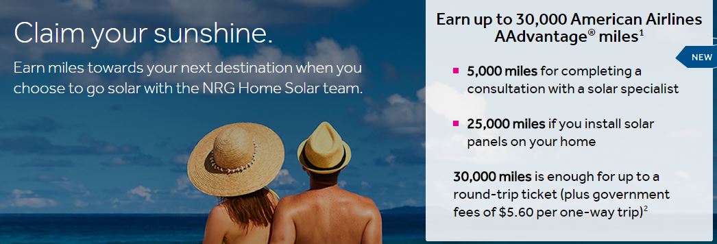 NRG Home Solar is offering 5,000 American Airline AAdvantage miles for setting up a FREE consultation to discuss a solar energy solution for your home and an 25,000 additional miles if signup and install solar panels.