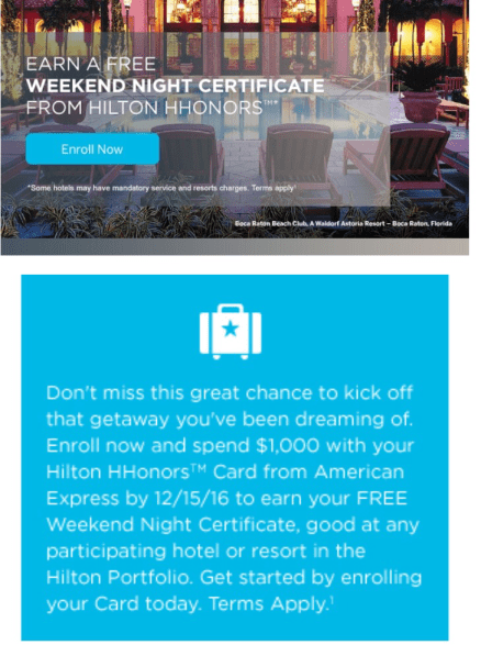I just received an email from American Express offering me a free weekend night certificate valid at any almost any Hilton hotel if I spend $1,000 on my Hilton HHonors American Express card by December 15th. The free weekend night is valid from 12 months of issuance so you have potentially almost all of 2017 to use it if you time the spending right. If you have the card, here is the link to try and see if you are targeted.