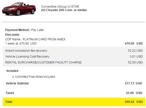 Now trust me I understand there are ways to get cheap rentals including using tools like AutoSlash but when I’m on vacation I want a quick and easy rental car experience. The ability to avoid lines and not having to deal with discounted car rental agencies with the endless upsells and crappier cars is worth it to me to lock in my price as shown above for my future rentals. I’m sure several of you will disagree with my approach on car rentals but this works for me and my style of travel, especially since I tend to rent premium vehicles (convertibles, large SUVs) on my trips.