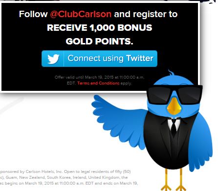 2) 1,000 Club Carlson Points – Club Carlson is offering members 1,000 Club Carlson points for following Club Carlson on Twitter. To earn your free points, register here and follow @ClubCarlson on Twitter – it’s that simple!