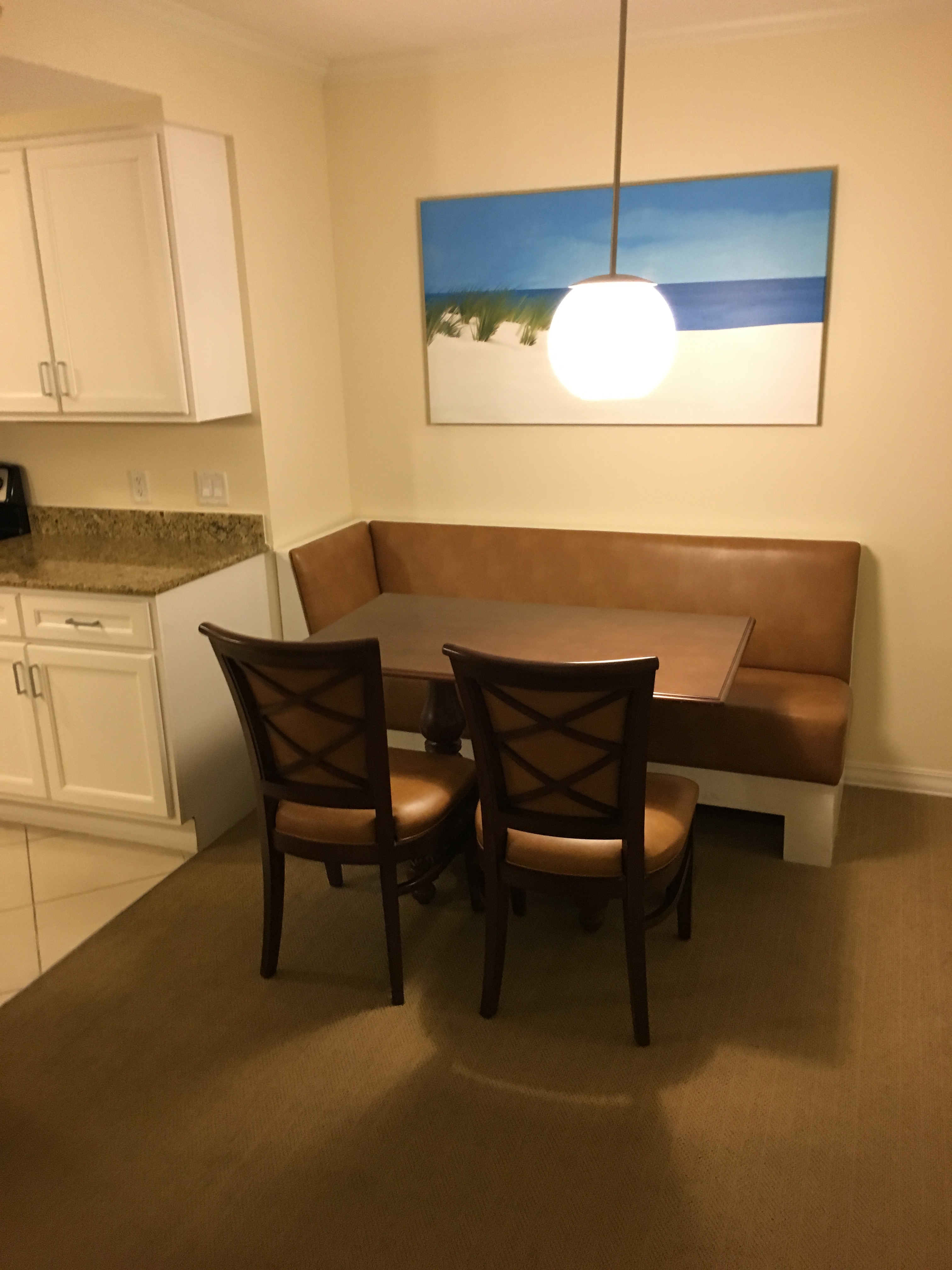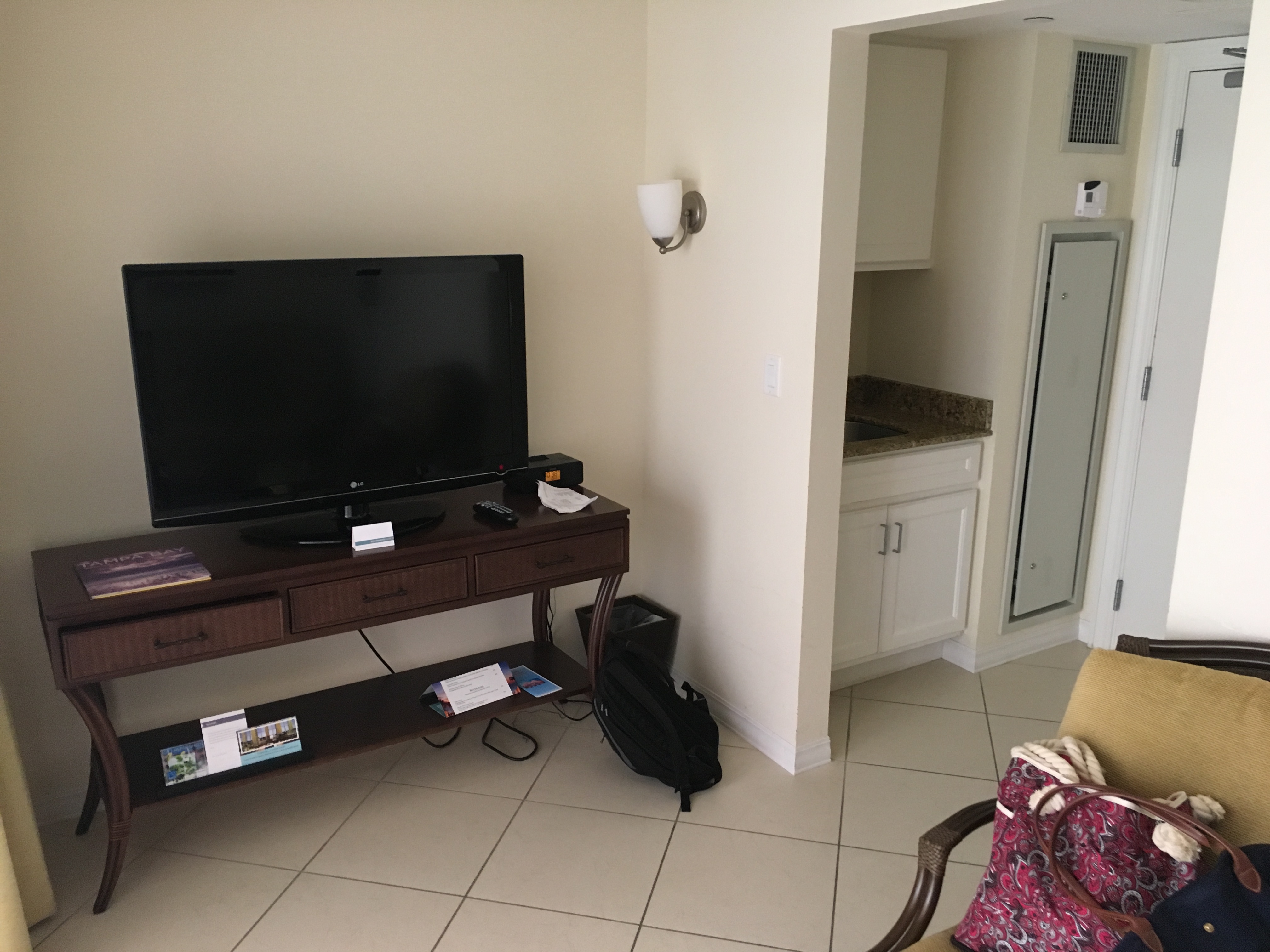 To the right when you walk in is a sink which I didn’t find useful considering there is a sink in the bathroom already. Straight ahead in the room is the living room of the cabana with a sofa and TV (and nice cold AC to escape the Florida heat). Additionally, there is also a safe for those that are wondering if you wanted to store any valuables.