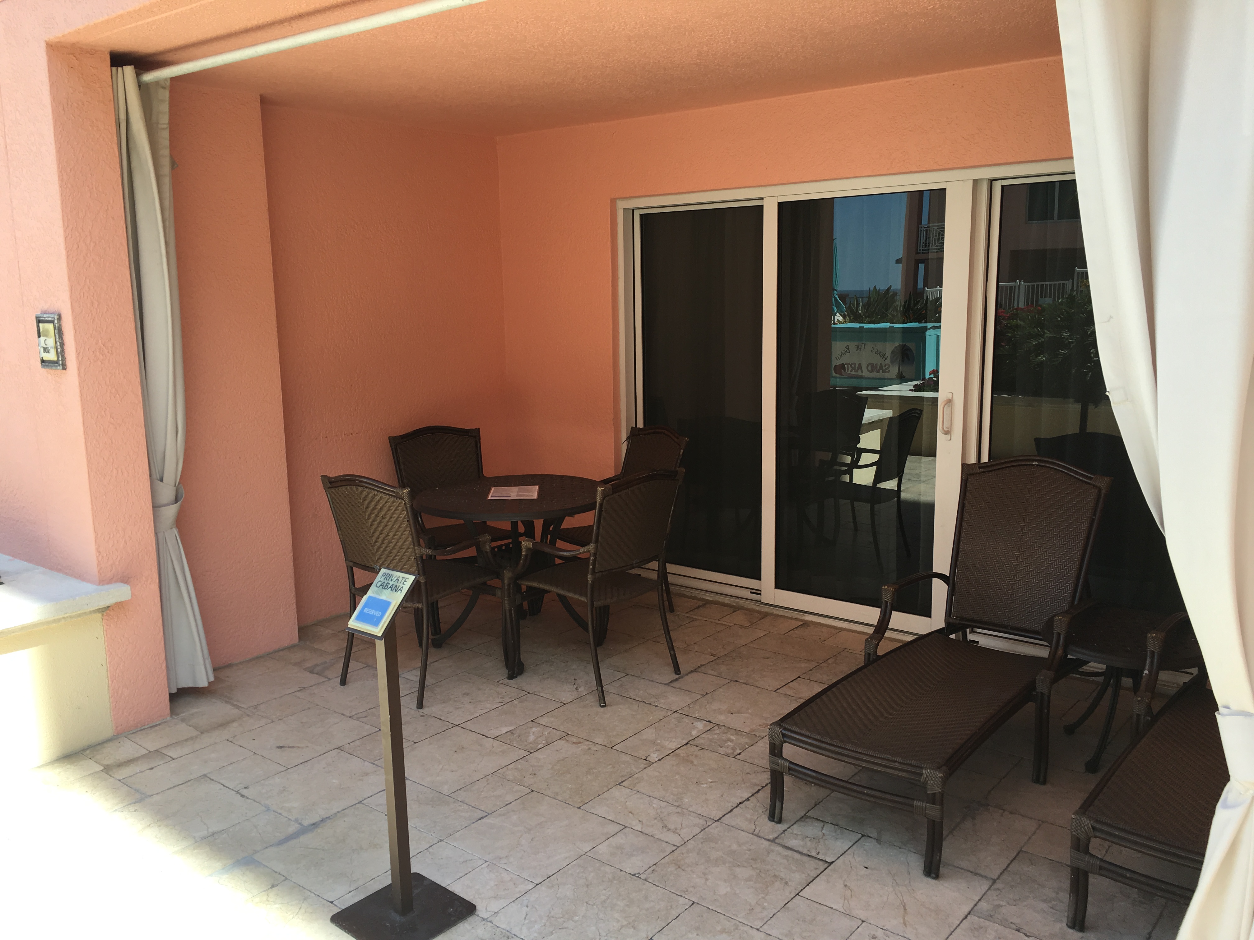 At the end of the room, there is a sliding glass door that leads out to a covered area with a table and 4 chairs plus two loungers. All of this seating is only for your cabana and there is small sign in front telling others these are reserved.