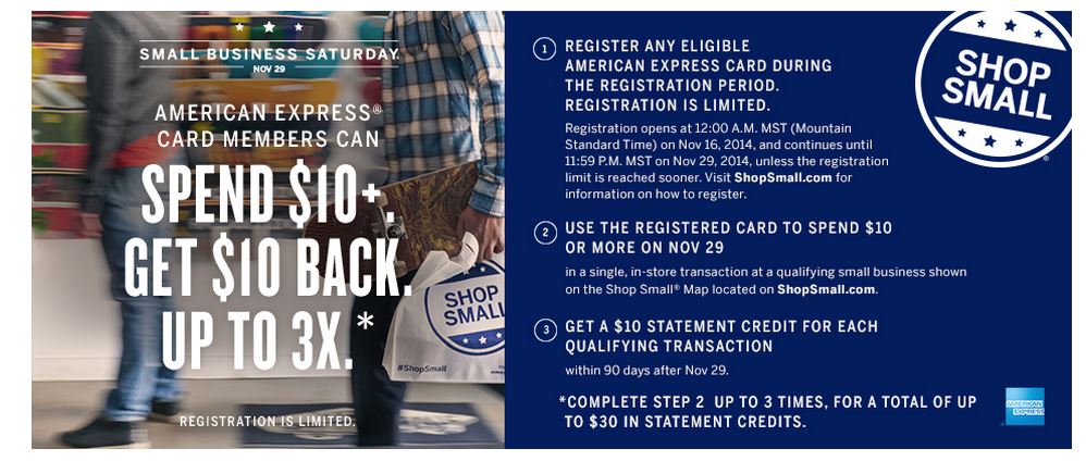 3) Reminder to Signup for American Express Small Business Saturday – Every year on the Saturday after Thanksgiving, American Express runs a promotion encouraging customer to shop at small businesses by givine customers a statement credit for purchases at these small businesses. This year American Express is offering $30 in statement credits per American Express card. In order to achieve the full $30 credit, you must make 3 separate transaction of at least $10 at a qualifying small business (check to see what businesses qualifies here).